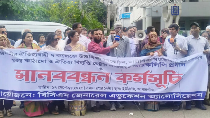 রাজধানীর সাতটি সরকারি কলেজকে নিয়ে ‘ঢাকা সেন্ট্রাল ইউনিভার্সিটি’ গঠনের প্রস্তাবের প্রতিবাদে শিক্ষকরা অবস্থান কর্মসূচি ও মানববন্ধন করেছেন। বুধবার (১৭ সেপ্টেম্বর) দুপুরে বিশ্ববিদ্যালয় মঞ্জুরি কমিশনের (ইউজিসি) সামনে বিসিএস সাধারণ শিক্ষা ক্যাডারের ব্যানারে এই কর্মসূচি অনুষ্ঠিত হয়।